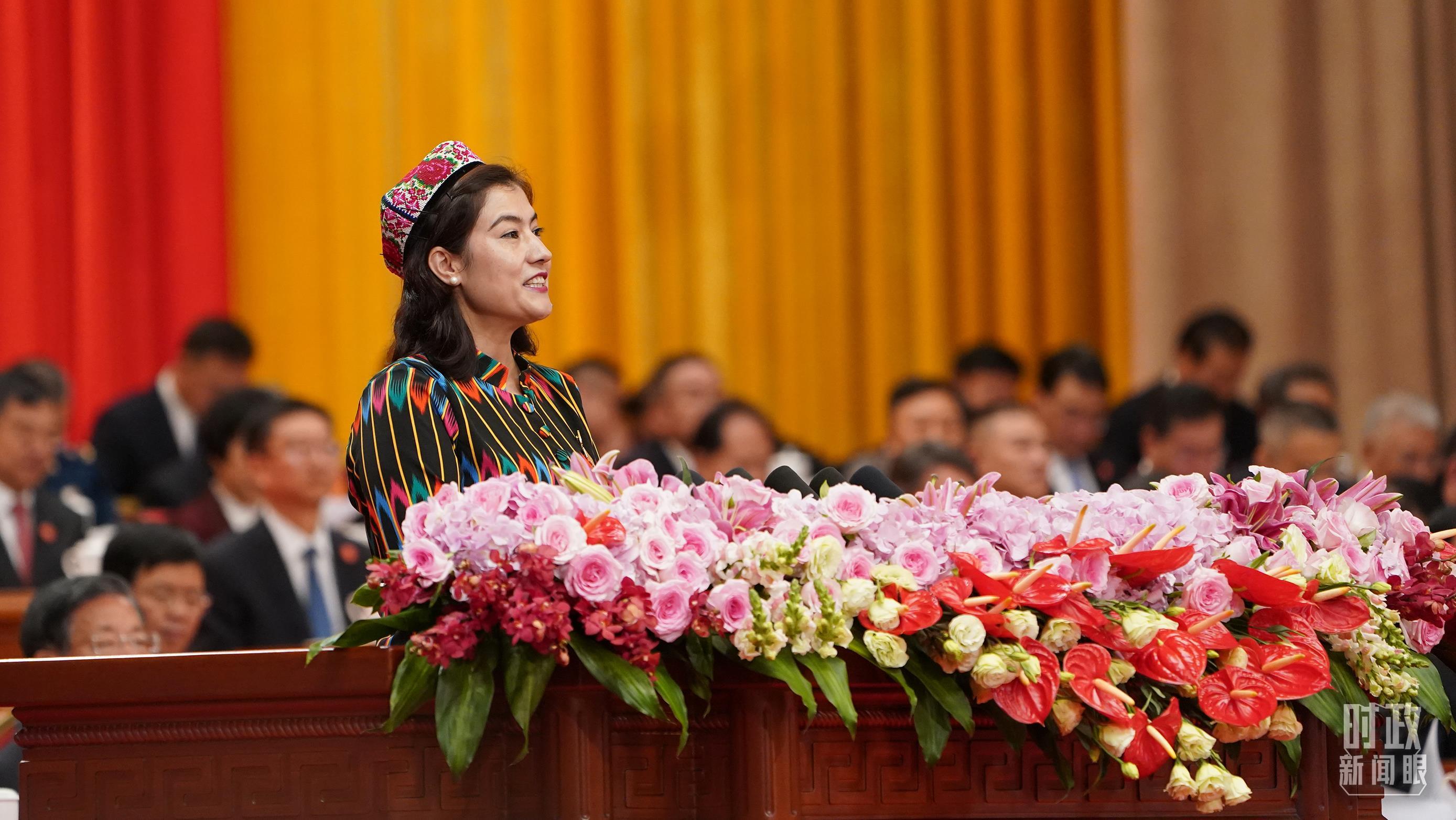 喀什地区巴楚县童梦幼儿园园长艾米拉古丽阿不都作为尔族群众代表发言。她曾见证了自己所在的幼儿园由低矮的土坯房变成标准化幼儿园,成为乡村最漂亮的建筑。